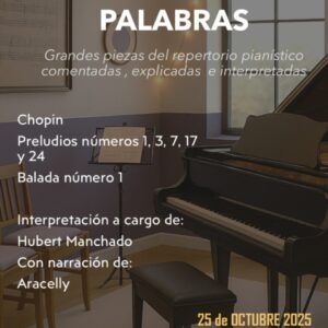 RESERVA Y VENTA: hubertmanchado@gmail.com Grandes obras del repertorio pianístico. comentadas, explicadas e interpretadas. Programa: selección de Preludios de Chopin y Balada Nº1 op. 23 de Chopin La experiencia consiste en dar un enfoque a la narración e interpretación para conseguir llegar a los secretos más profundos de una obra, a los misterios que contiene. Intentar […]